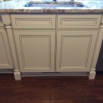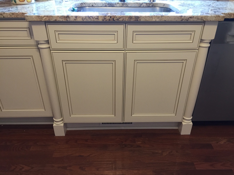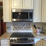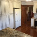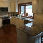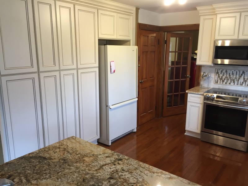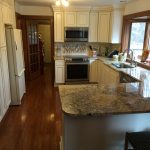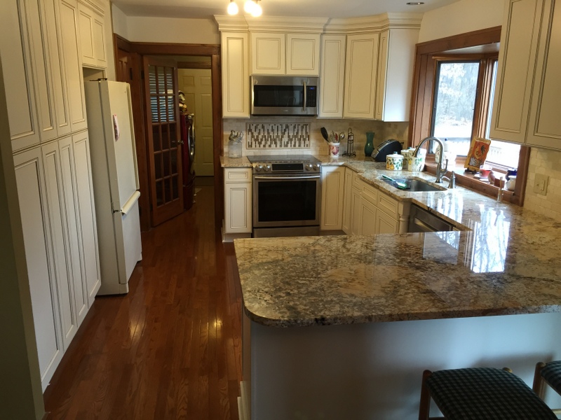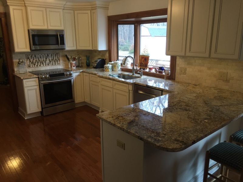 At New Design, we love to update a space and make it feel like it should have always been that way. In this kitchen, a large pantry wall maximized storage while the peninsula creates a great work space and seating area.The glazed antique white cabinets pop against the cherry colored floors. A natural stone backsplash with cracked glass mosaic behind the range gives just enough detail without distracting from the gorgeous granite countertops. The tones in the granite tie all of the colors together to complete the design.