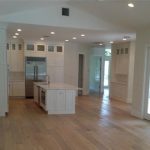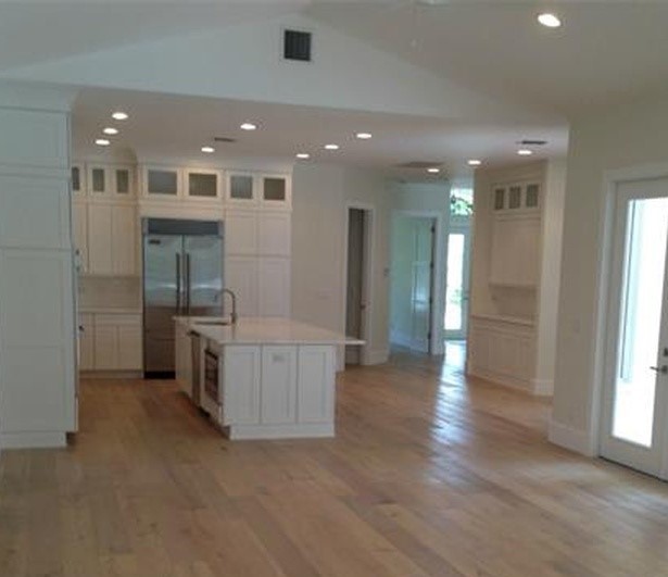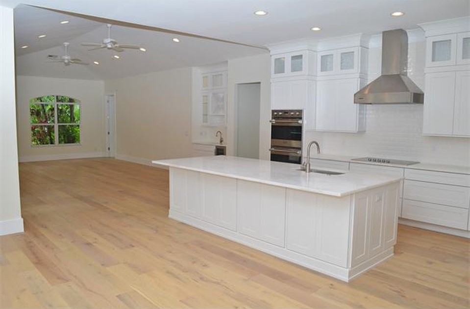 A timeless kitchen in white. Shaker white cabinets with Silver Cloud granite and a hand scraped distressed birch floor in espresso.