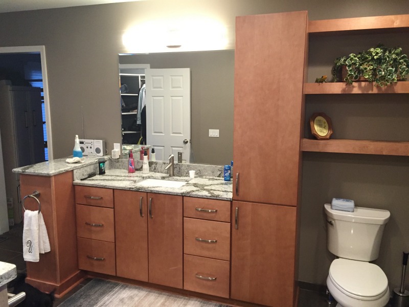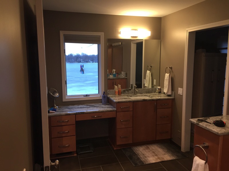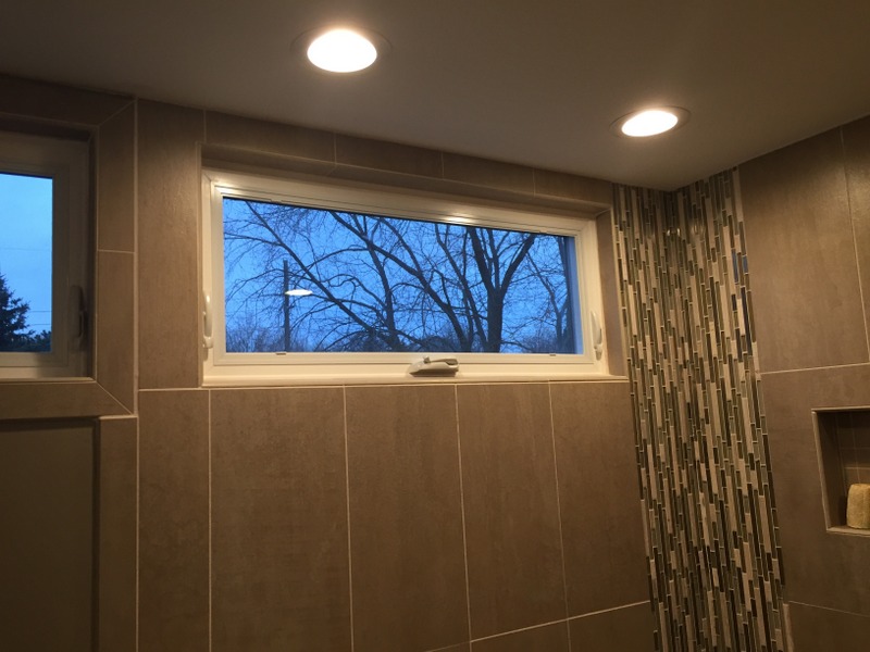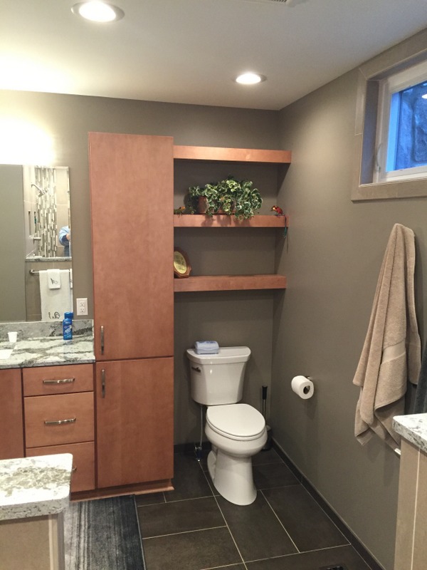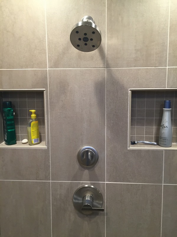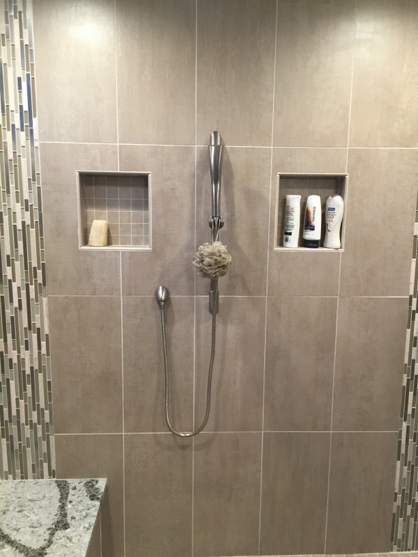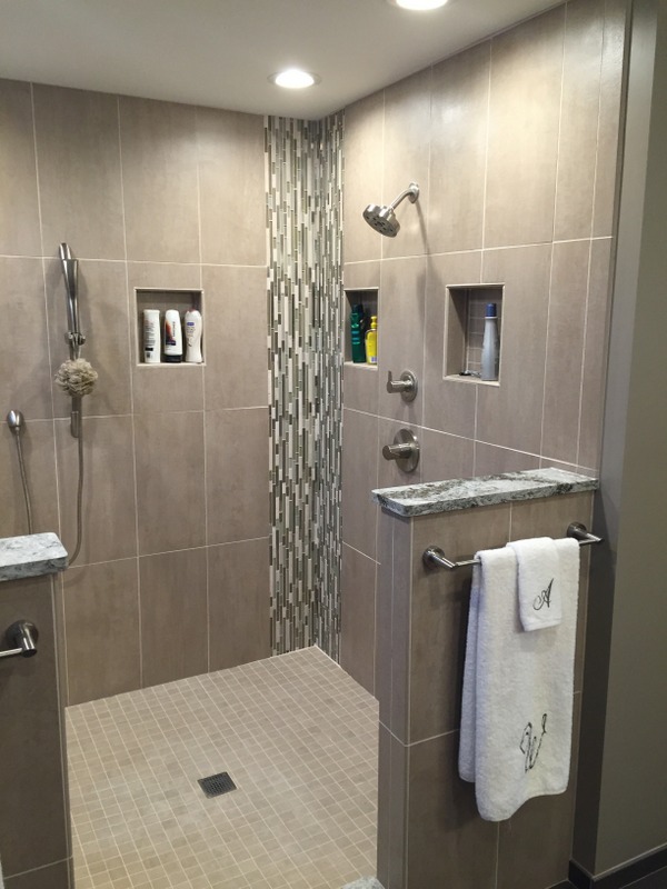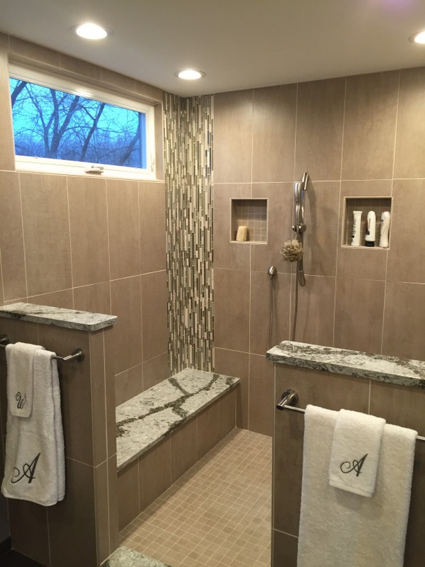 We remodeled 2 bathrooms with similar materials but very different color selections. The first bathroom uses darker tones through out to give a dramatic feel. The second bathroom uses light tones to give the feel of a seaside retreat.