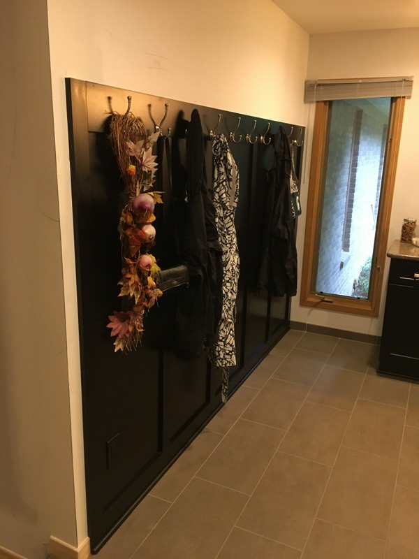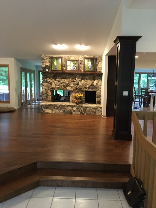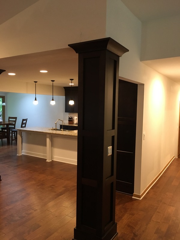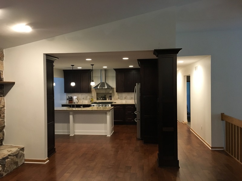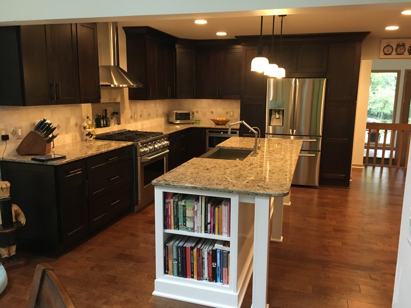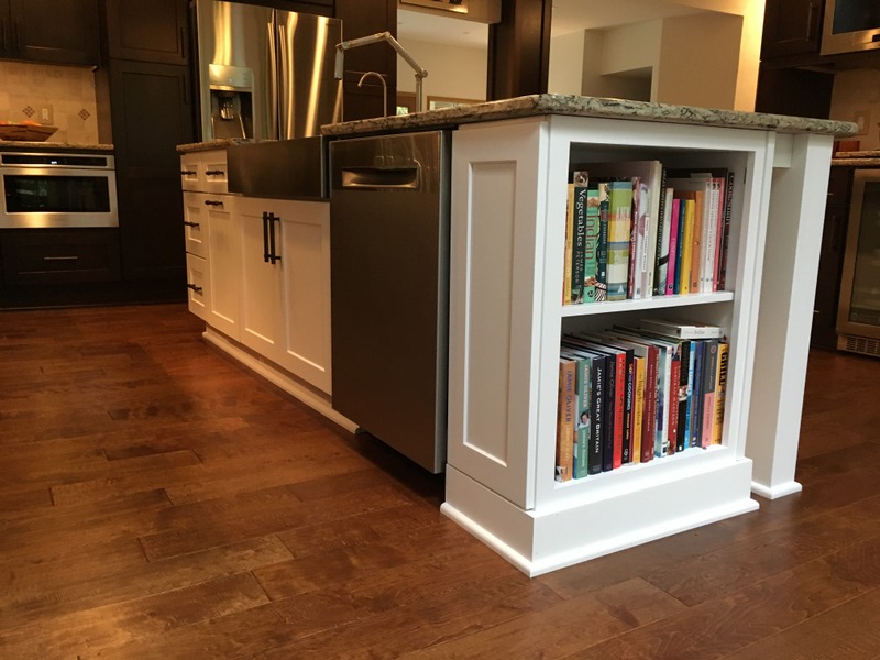 At New Design, we love to update a space and make it feel like it should have always been that way. In this kitchen, a large pantry wall maximized storage while the peninsula creates a great work space and seating area.The glazed antique white cabinets pop against the cherry colored floors. A natural stone backsplash…