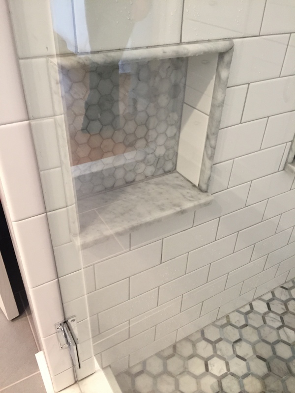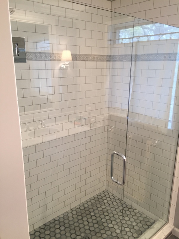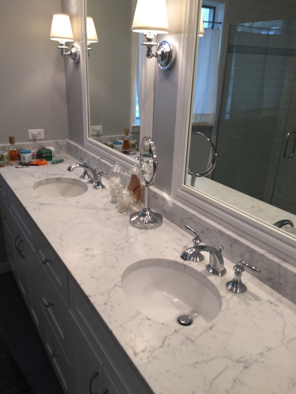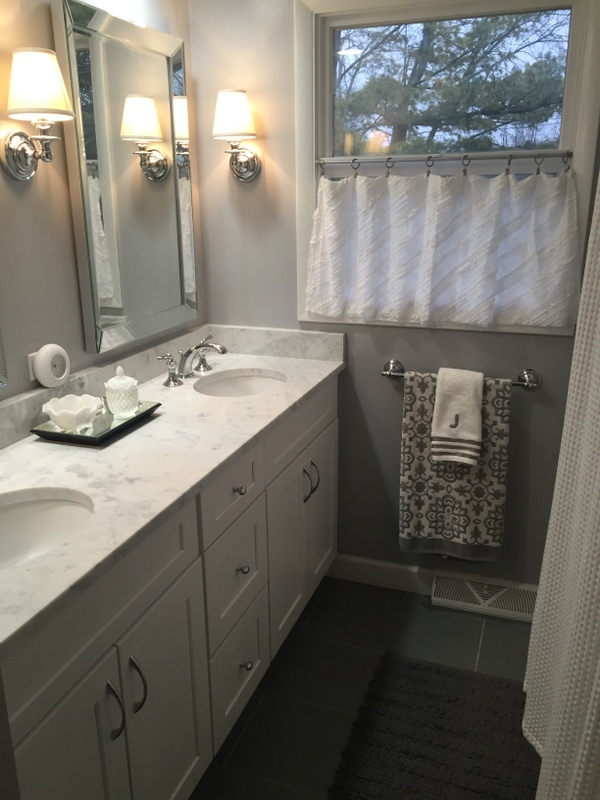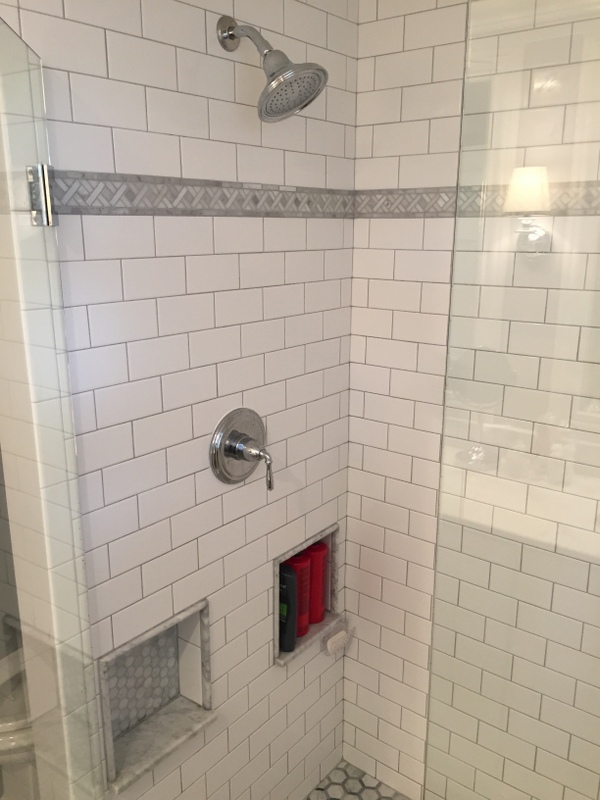 We remodeled two full bathrooms. The design style for both bathrooms is light and classic for a timeless look. We combined white shaker cabinets, marble countertops, marble tile and chrome fixtures to complete the space.