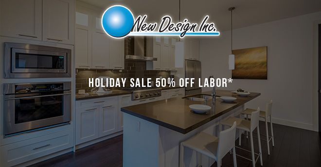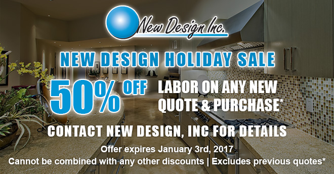 New Design, Inc. is giving 50% off LABOR on any new quote and purchase through January 3rd, 2017! Contact New Design, Inc. for details. *Excludes previous quotes | Cannot be combined with any other discounts | Offer expires January 3rd, 2017